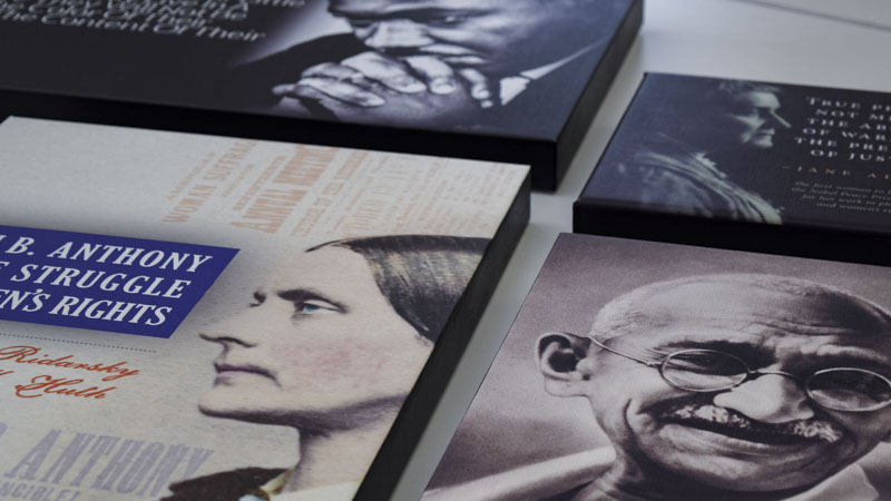 Glossy acrylic posters make simply beautiful additions to offices, lobbies, and meeting rooms, and historical photos and portraits shine and gain dimension when second-surface applied to acrylic panels. These standoff displays help prevent vandalism and other natural damage by having the imagery on the back of the display, but names, dates, ranks, or logos can easily be adhered to the front of these panels to create a natural dropshadow. Our experienced team can also create custom shaped whiteboards or magnetic dry-erase displays with acrylic panels.